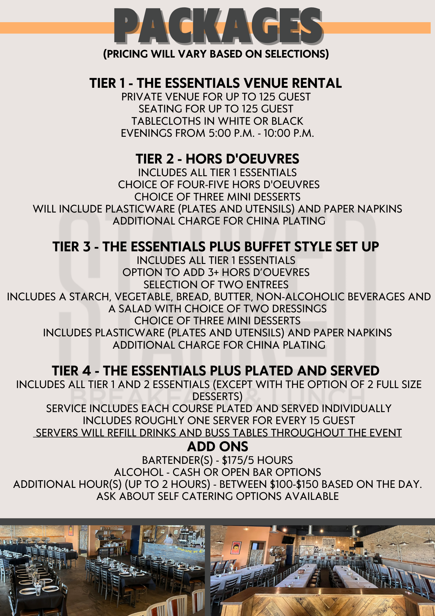 Stacked Venue offers a stylish, spacious, and private industrial-style setting, perfect for events of up to 125 guests. Whether you're planning a happy hour, school reunion, rehearsal dinner, wedding reception, holiday party, or corporate event, our dedicated team is here to guide you every step of the way.